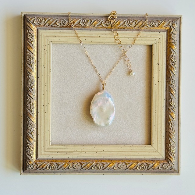 オイスターバロックパ―ルの超美人さんのネックレスです♪ 表面のきめ細かい様子が、白無垢を着た花嫁さんのようでしたので、白無垢と名付けました。 完全一点物。(セットで使えるピアス/イヤリングもございます♪) オイスターバロックバールとは、その形が牡蠣の貝殻に似ていることから名づけられました。 オイスターバロックパールにも、縦長なものから丸に近いのもまで、いろいろな形があります。 こちらのペアは、美しい縦長タイプのものです♪ 大きさは31.5×16.5 厚みは14.3mm と、本当に大きくて存在感があります! オイスターバロックパールの中でも形の美しいかなりの大粒です♪ 傷気もほとんどなく、上品なテリが特徴です。 モデルが着用しております長さは60㎝。 粒が大きいので、小粒のものよりも少し長めの着用がおすすめです♪ チェーンの長さは40~60cmまで、お好きな長さでご注文いただけますので オプションよりお選びください。 お揃いでご着用いただけるピアス/イヤリングも同時出品しておりますので、よろしければご覧ください♪ 完全一点物ですので、気になる方はお早目にどうぞ♪ バロックパールについてや、使用しております金具の説明は ショッピングガイドをご覧ください。