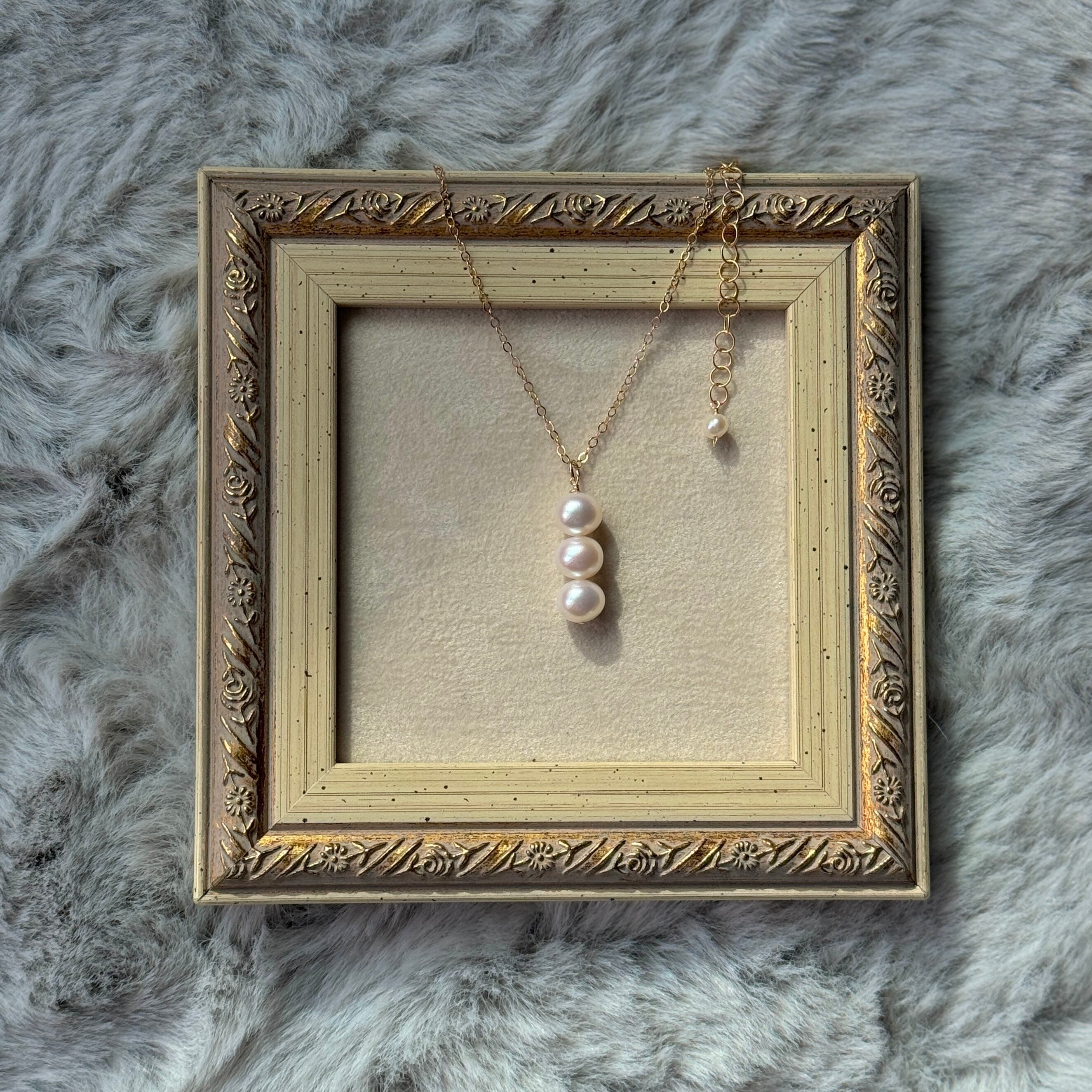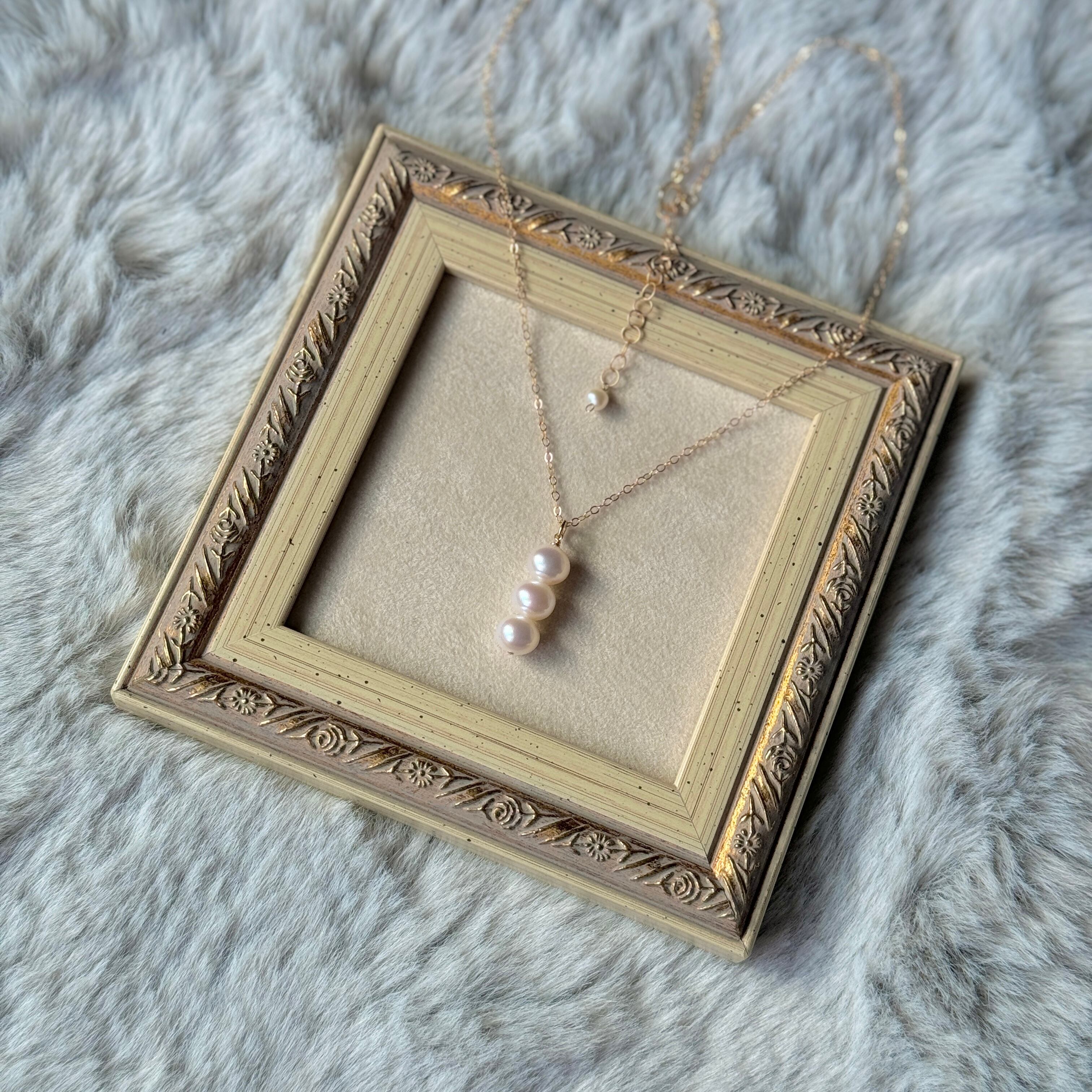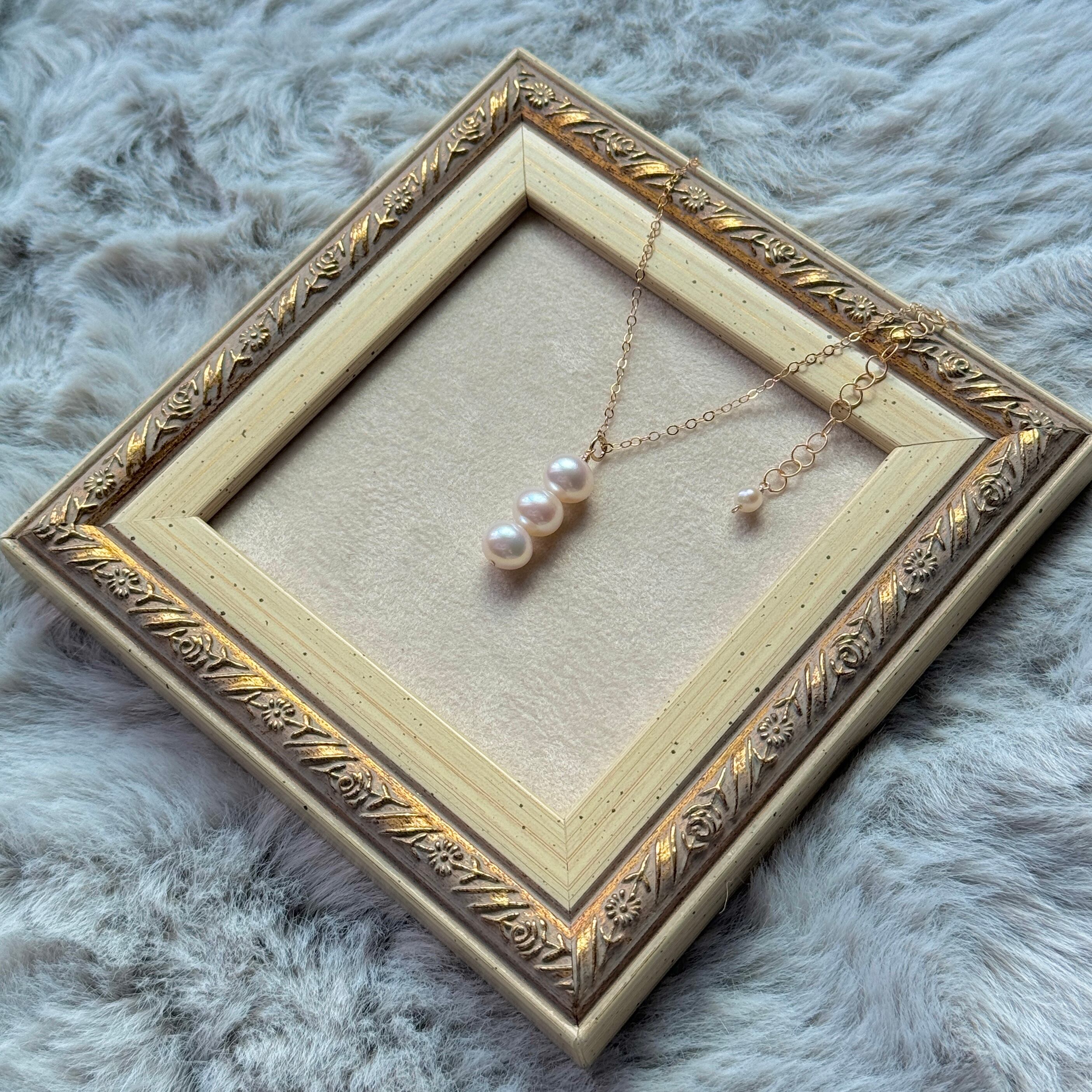 クォリティの良い淡水パールを使った、3連チャームのネックレスです♪