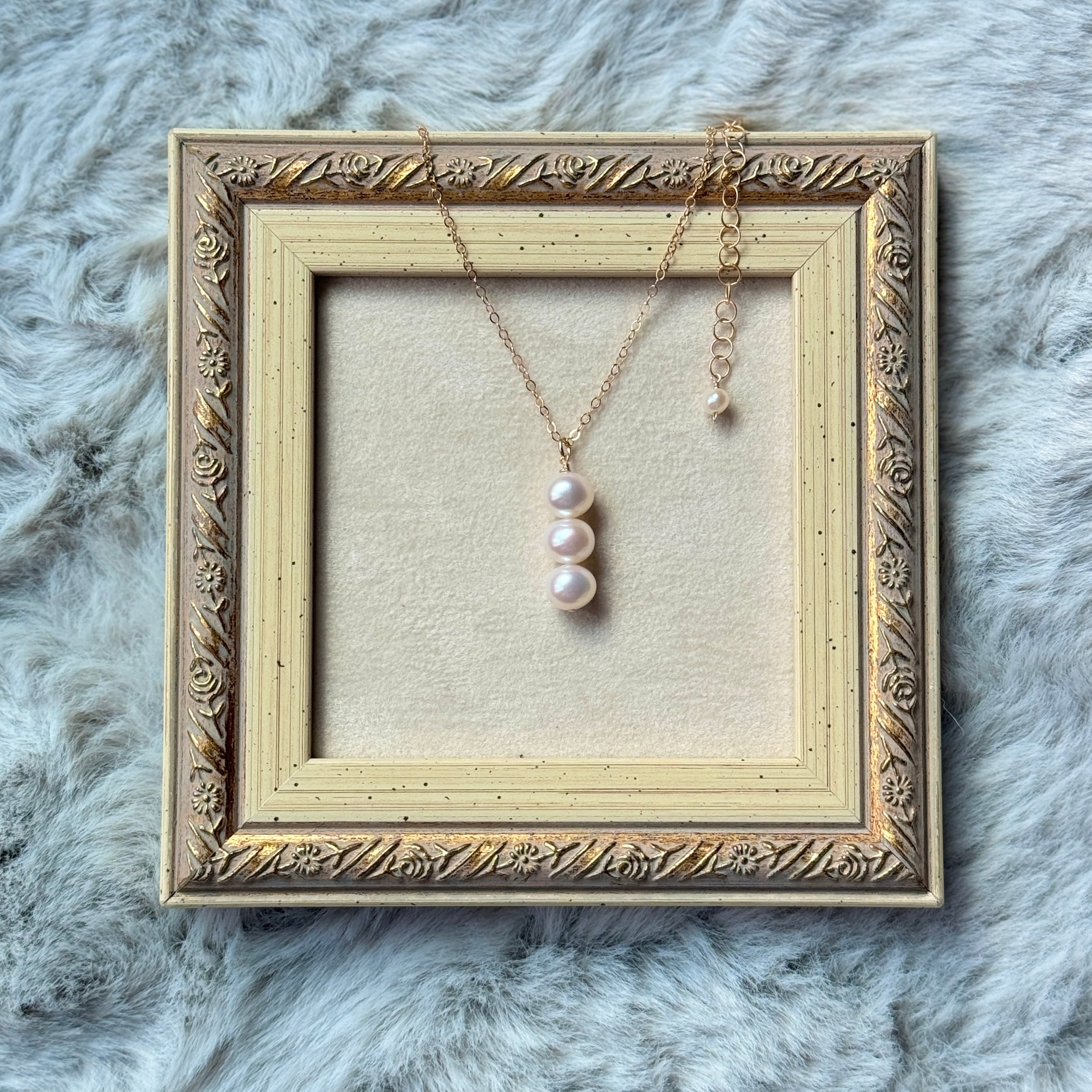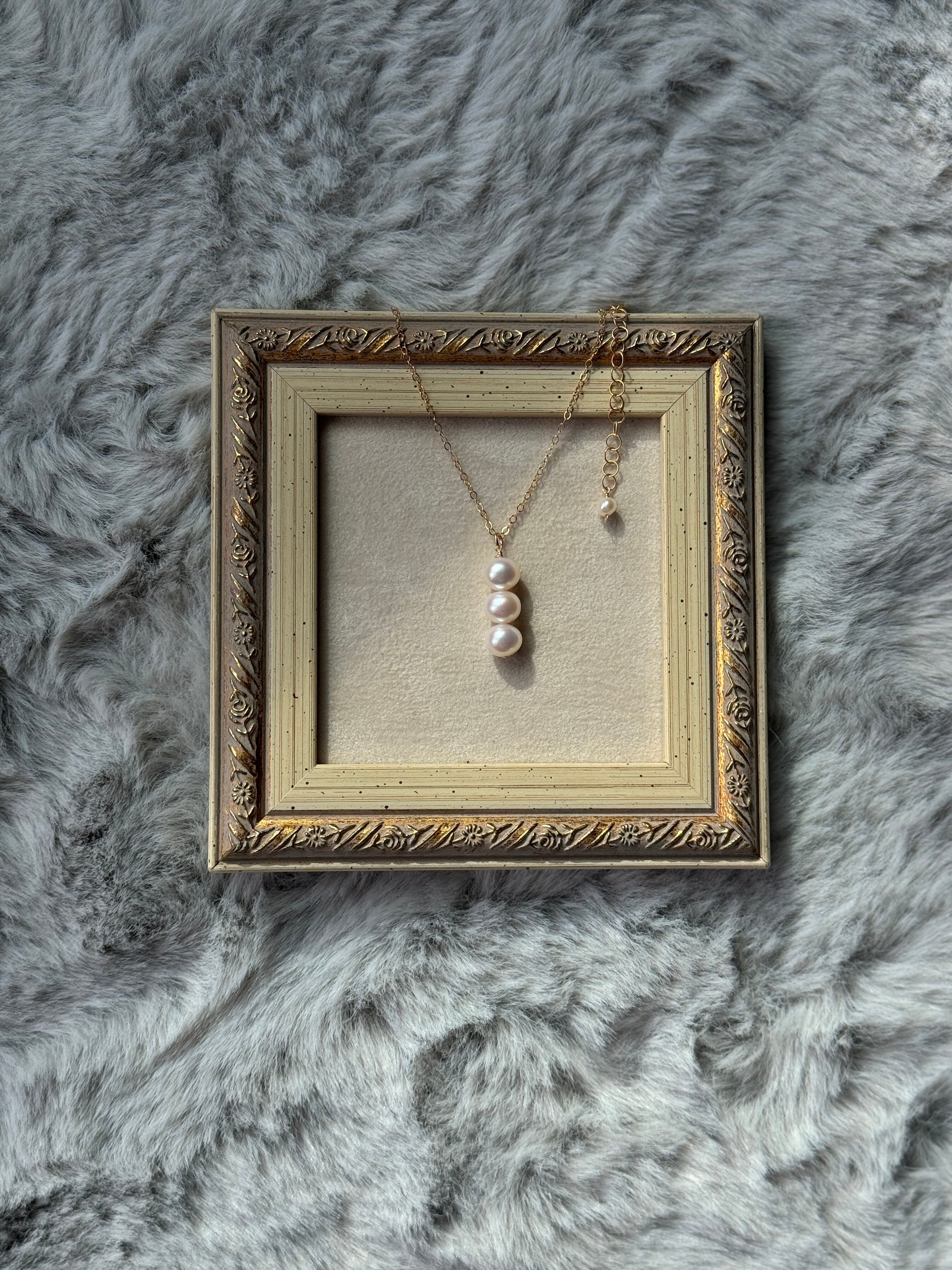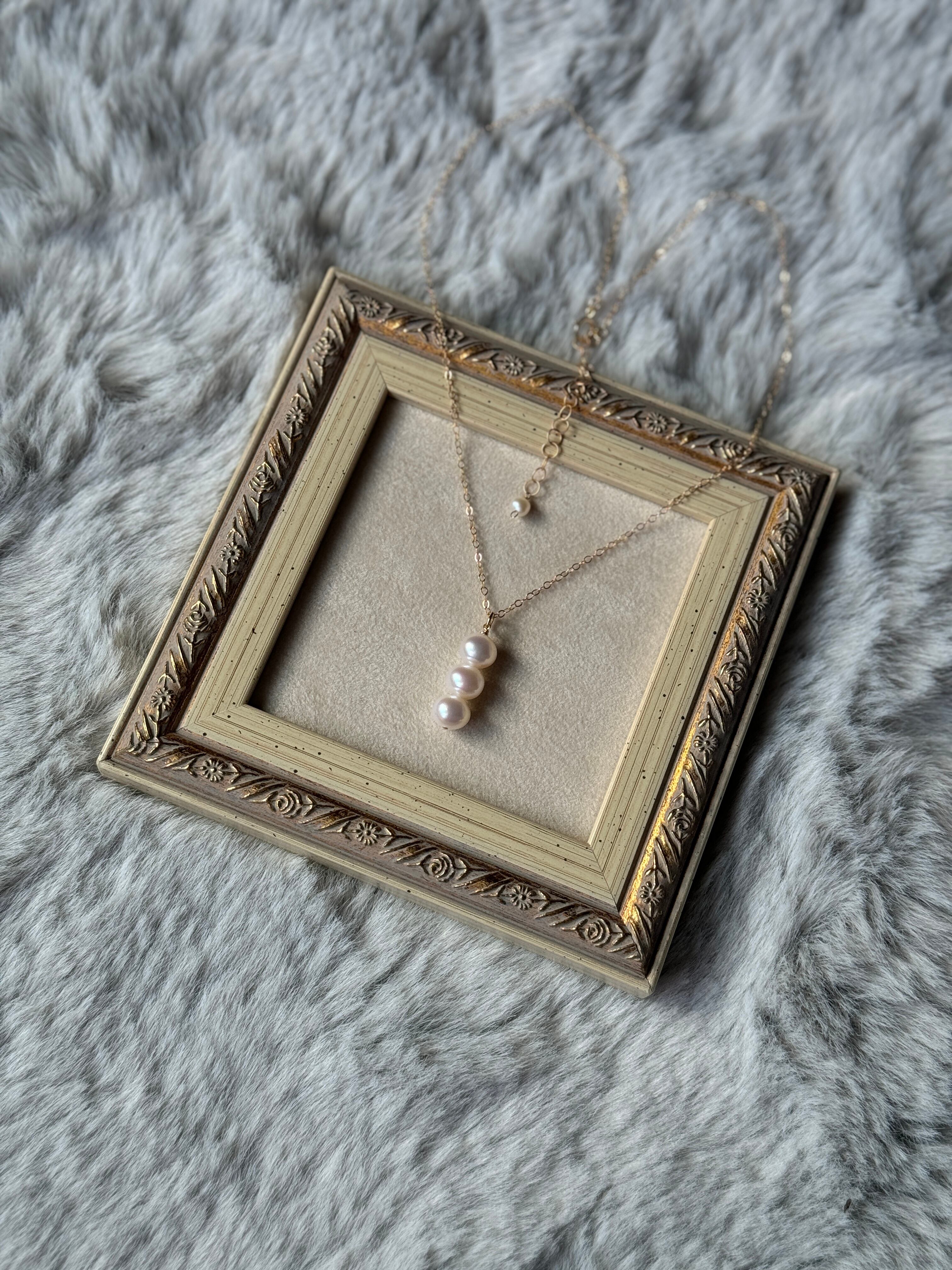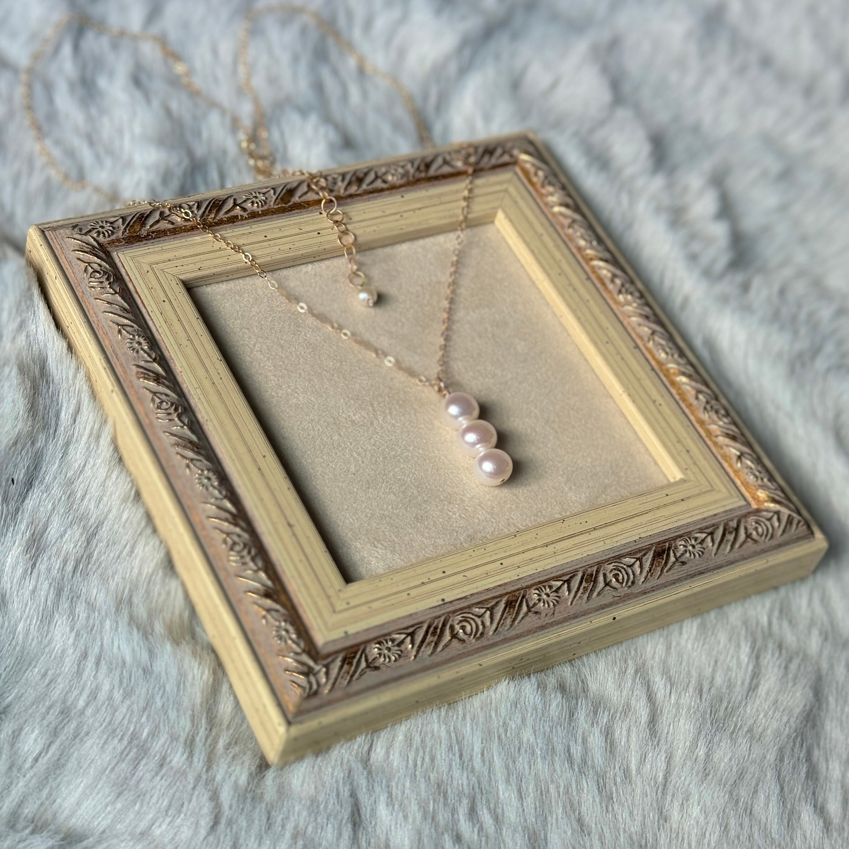 クォリティの良い淡水パールを使った、3連チャームのネックレスです♪