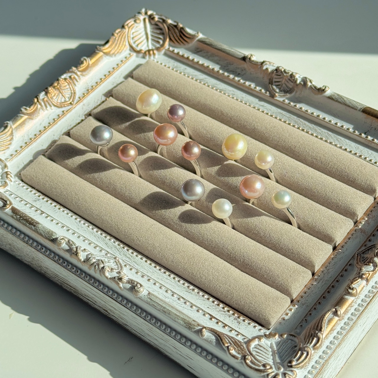 アイボリー系に写っている写真もございますが、こちらはそれぞれの干渉色やテリの反射によるもので、大きい方のパールは基本的にホワイトです♡